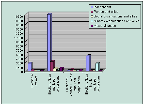 b) In settlements of a population exceeding 10,000 and in the districts of the capital, voters of the settlement elect the members of the local municipal corporation under a mixed electoral system. That means that app. 60 and 40 percent of the mandates are allocated, respectively, in single-member constituencies and from a compensatory list.